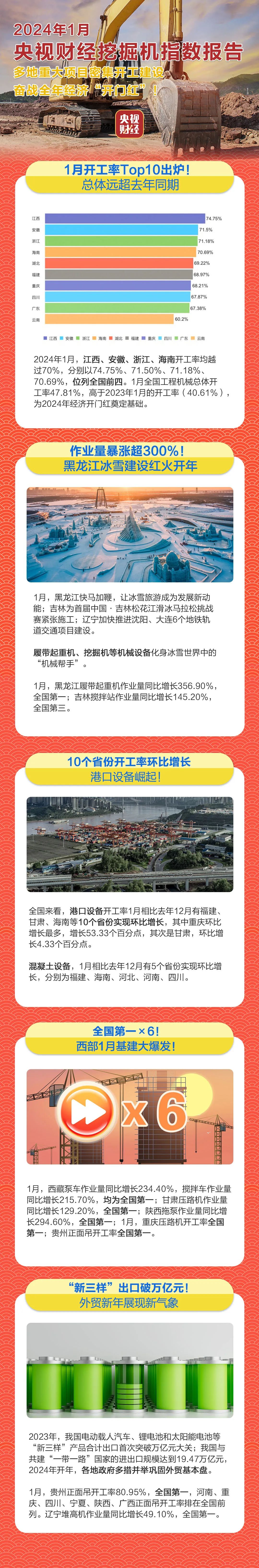 挖掘机是基础设施建设的“标配”,是反映基础设施建设、观察固定资产投资等经济变化的风向标。央视财经与好体育投注网站重工、树根互联联合打造的“央视财经挖掘机指数”发布了最新相关数据。新年伊始,我国多地重大项目建设密集开工,奋战全年经济“开门红”。多个省份稳定经济运行的压舱石作用持续凸显。