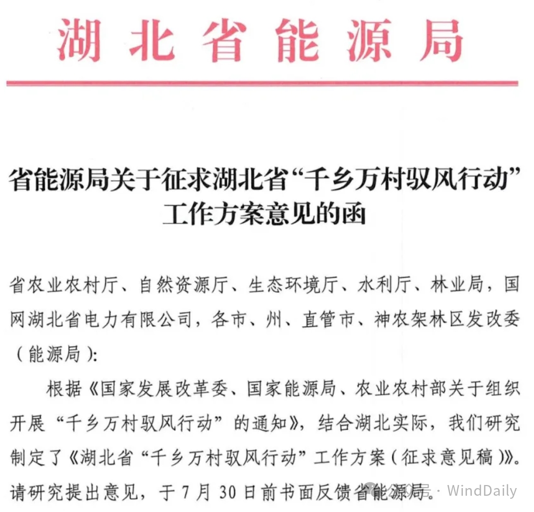 WindDaily获悉,湖北省能源局近日正式发布《省能源局关于征求湖北省“千乡万村驭风行动”工作方案意见的函》。据文件,2024年,湖北省安排100万千瓦左右乡村风电建设规模,因地制宜选择100个村先行试点。每个地市(含恩施自治州)可申报一个试点县(市、区),每个试点县(市、区)原则上建设规模不超过7万千瓦,布点7-10个行政村,单个村不超过2万千瓦。潜江、仙桃市原则上建设规模不超过3万千瓦,布点3-5个行政村。天门市的乡村风电项目纳入国家农村能源革命试点县建设实施方案,不再重复申报。在项目选址方面要求风资源可利用小时数不低于1800小时,业主优选要同一省级企业原则上只参与一个试点县项目建设,同等条件下优先考虑在所属县市投资调峰储能能力项目的企业。具体如下: