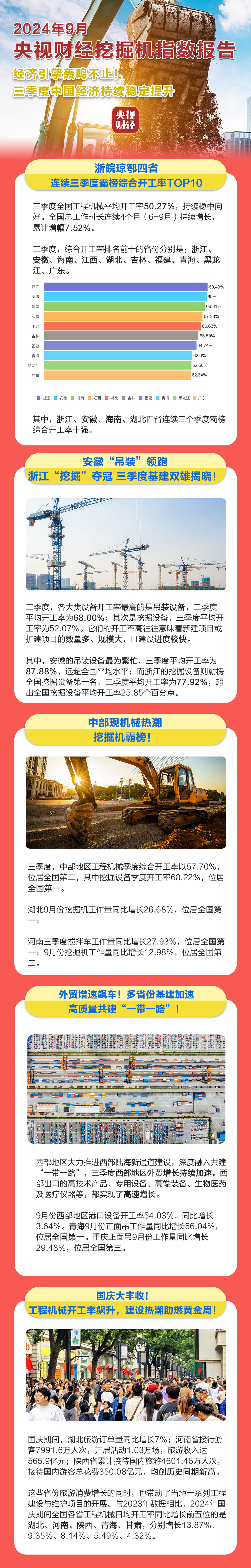 这些省份旅游消费增长的同时,也带动了当地一系列工程建设与维护项目的开展。与2023年数据相比,2024年国庆期间全国各省工程机械日均开工率同比增长前五位的是湖北、河南、陕西、青海、甘肃,分别增长13.87%、9.35%、8.14%、5.49%、4.32%。