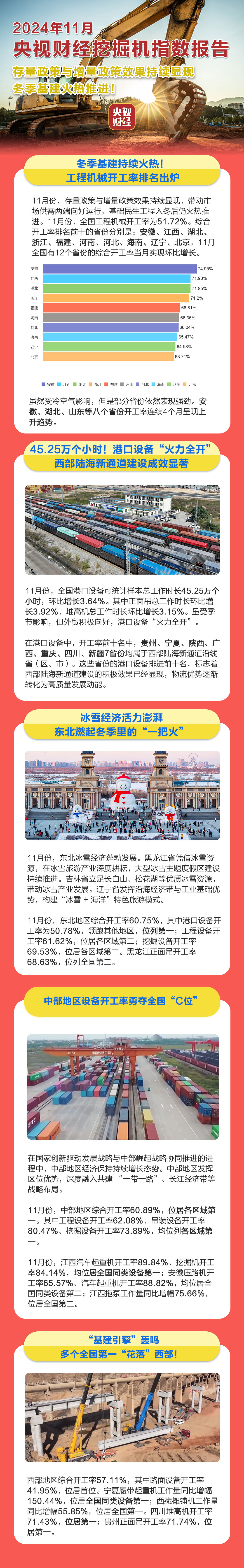 11月份,存量政策与增量政策效果持续显现,带动市场供需两端向好运行,基础民生工程入冬后仍火热推进。11月份,全国工程机械开工率为51.72%。综合开工率排名前十的省份分别是:安徽、江西、湖北、浙江、福建、河南、河北、海南、辽宁、北京,11月全国有12个省份的综合开工率当月实现环比增长。