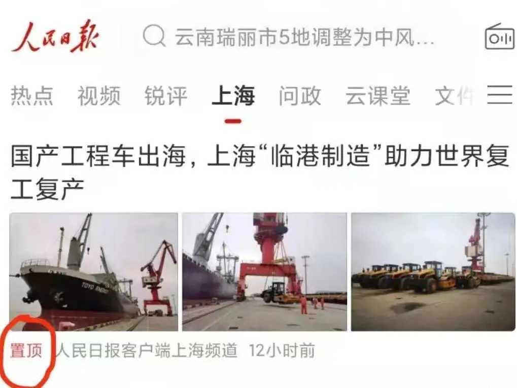 4月3日,《人民日报》客户端上海频道也“头条置顶”了这条消息,并迅速达成“10万+”。文中豪迈地写到:“国产工程车出海,助力世界复工复产”。