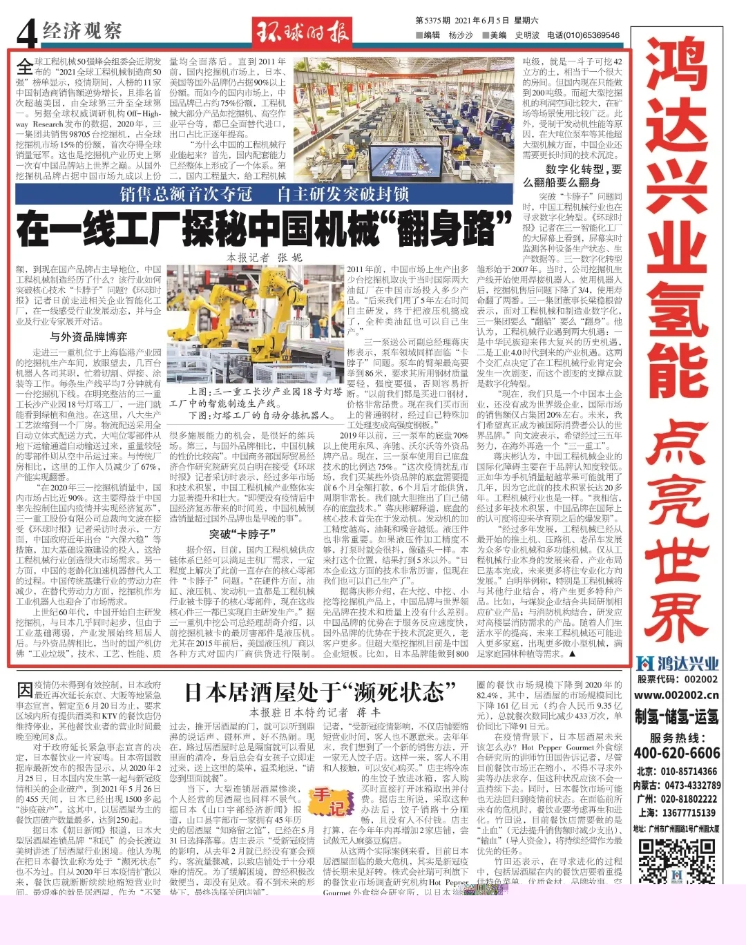 6月5日,《环球时报》以《在一线工厂探秘中国工程机械“翻身路”》为题,大篇幅报道好体育投注网站挖掘机2020年销量夺冠全球背后的故事。