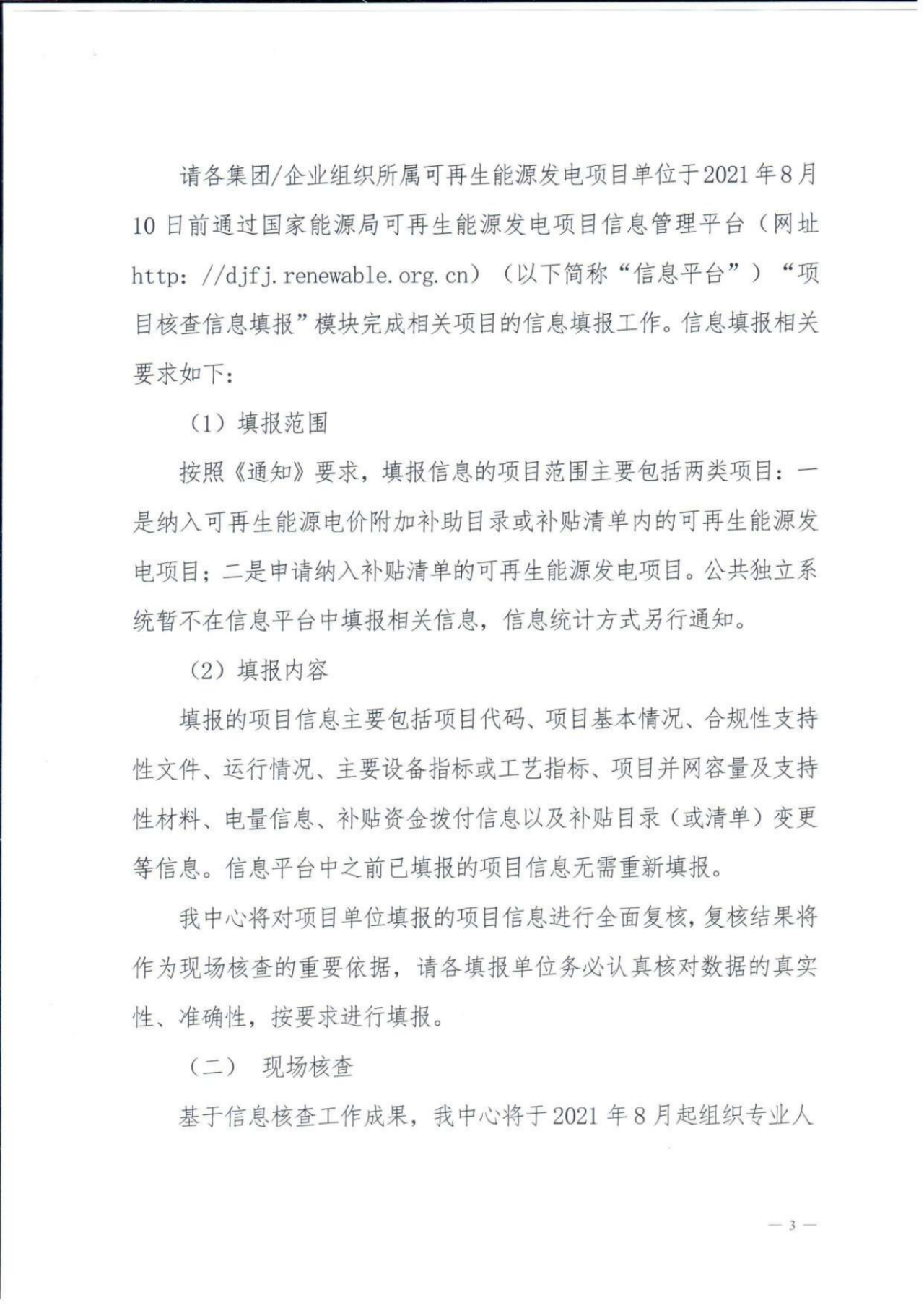 此次核查将采取信息核查与现场核查相结合的方式,各发电企业需要在8月10日前通过国家能源局可再生能源发电项目信息管理平台完成相关项目的信息填报工作。 根据《关于开展可再生能源电价附加补助资金核查工作的通知》的核查内容要求,重点核查内容包括9方面内容:一是电网企业是否严格按照《资金管理办法》执行可再生能源发电政策;二是电网企业是否规范管理并及时、公平拨付补贴资金;三是电网企业是否按相关补贴政策、拨付要求发放补贴资金;四是电网企业是否按要求完成绩效评价;五是可再生能源发电项目是否存在手续不全、规避行业管理、实际并网装机容量与核准(备案)容量不一致等情况;六是可再生能源发电项目是否存在上网电量异常的情况;七是可再生能源发电项目是否已达合理利用小时数;八是生物质发电项目是否存在违规化石燃料掺烧及排放不达标问题;九是公共独立系统运行情况、运维成本核算等; 基于信息核查工作成果,国家可再生能源信息中心将于2021年8月起组织专业人员分组开展项目现场核查工作,本年度项目核查重点关注7项内容如下: 一是发电项目核准(备案)、电价批复、建设及并网等程序是否符合国家相关政策,支持性文件是否齐全; 二是可再生能源发电项目是否存在实际并网装机容量与核准(备案)容量不一致的情况; 三是可再生能源发电项目是否存在上网电量异常的情况; 四是可再生能源发电项目是否达到合理利用小时数; 五是生物质发电项目是否存在化石燃料掺烧不符合要求和排放不达标的情况; 六是公共独立系统运行情况及运行成本; 七是补贴资金拨付是否规范、及时。