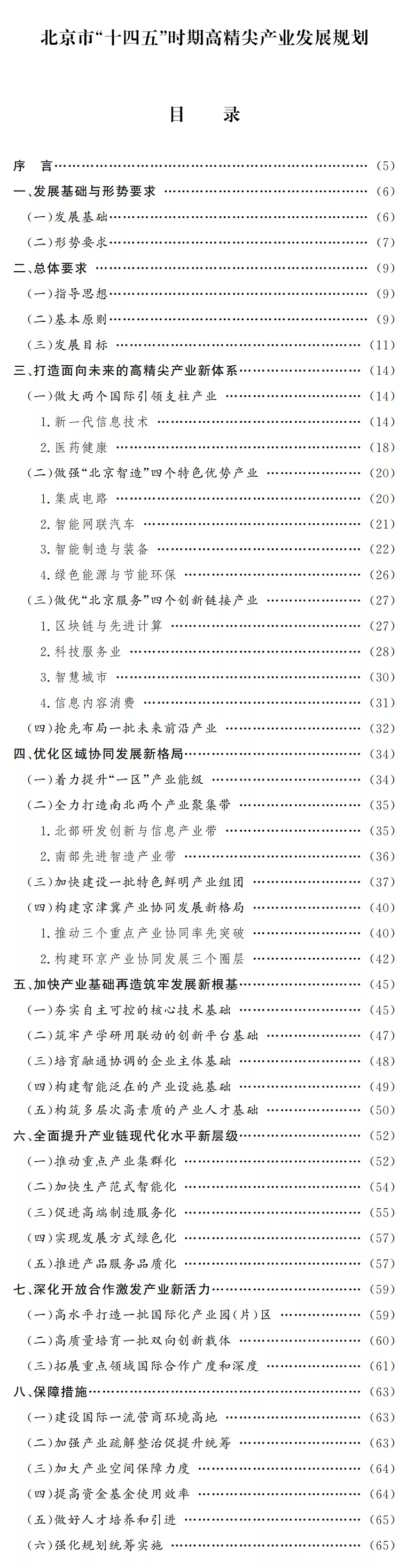 “十四五”时期是我国开启全面建设社会主义现代化国家新征程、向第二个百年奋斗目标进军的第一个五年,也是北京落实首都城市战略定位、建设国际科技创新中心、构建高精尖经济结构、推动京津冀产业协同发展的关键时期。在全球创新版图重构以及我国加快构建双循环新发展格局的时代背景下,北京高精尖产业要坚持以首都发展为统领,巩固产业调整转型的良好势头,准确把握新发展阶段,深入贯彻新发展理念,主动融入新发展格局,全力推进高质量发展,切实肩负起国家赋予的使命和责任。 本规划根据《中共北京市委关于制定北京市国民经济和社会发展第十四个五年规划和二〇三五年远景目标的建议》《北京市国民经济和社会发展第十四个五年规划和二〇三五年远景目标纲要》制定,提出的高精尖产业主要涉及先进制造业、软件和信息服务业、科技服务业,是对“十三五”时期十大高精尖产业内涵的拓展和提升,实施期限为2021年至2025年,远景展望到2035年。 党的十八大尤其是2014年习近平总书记视察北京并发表重要讲话以来,全市统筹疏解非首都功能、构建高精尖经济结构、推动京津冀产业协同发展,高精尖产业进入创新发展、提质增效新阶段,为“十四五”时期构建现代产业体系奠定了坚实基础。 产业发展能级实现新跃升。2020年全市高精尖产业实现增加值9885.8亿元,占地区生产总值比重达到27.4%,较2018年提高2.3个百分点;培育形成新一代信息技术(含软件和信息服务业)、科技服务业两个万亿级产业集群以及智能装备、医药健康、节能环保、人工智能四个千亿级产业集群。 产业创新能力明显提高。2020年高精尖产业研发经费投入占收入比重7.3%。创建3个国家级制造业创新中心、92个企业技术中心和8个工业设计中心,布局人工智能、量子、脑科学等一批新型研发机构。拥有独角兽企业93家,数量居世界城市首位。涌现出柔性显示屏、国内首款通用CPU(中央处理器)、新冠灭活疫苗、5G+8K(第五代移动通信技术+8K超高清分辨率)超高清制作传输设备、新型靶向抗癌新药、手术机器人、高精密减速器等具有全球影响力的创新成果。 产业项目落地取得丰硕成果。落地投产新能源整车产线,建成全球首个网联云控式高级别自动驾驶示范区。建设国内规模最大的12英寸集成电路生产线、8英寸集成电路国产装备应用示范线。国家级专精特新“小巨人”、制造业单项冠军、智能制造示范项目和系统解决方案供应商数量全国领先,涌现出福田康明斯“灯塔工厂”、小米“黑灯工厂”等行业标杆。率先启动建设国家网络安全产业园,聚集全国半数以上网络安全和信创企业。落地工业互联网标识解析国家顶级节点、国家工业互联网大数据中心和安全态势感知平台等一批重大基础设施平台。 产业提质增效迈出坚实步伐。2016年至2020年全市累计退出一般制造业企业2154家。2020年规模以上工业人均产值、规模以上制造业地均产值较2015年分别增长59%、19.2%;规模以上软件和信息服务业人均营业收入较2015年增长99.1%。 京津冀产业协同开创全新局面。京津冀三地协同推进规划共编、项目共享、企业互动、园区共建,“2+4+N”产业合作格局初步形成;城市副中心产业“腾笼换鸟”全面推进,积极对接雄安新区规划建设;汽车、医药、装备、大数据和云计算等领域的产业合作和项目落地取得重大突破。 “十四五”乃至更长时期,北京高精尖产业仍将处于大有可为的战略机遇期。从全球看,世界正经历百年未有之大变局,国际环境日趋复杂,经济和科技竞争更趋白热化,信息、生物、新材料、新能源等领域的技术突破与交叉融合,将对产业转型升级和变换发展赛道产生深刻影响;从国内看,我国经济已进入高质量发展新阶段,着力构建新发展格局,加快发展现代产业体系,将为北京高精尖产业创新发展注入新活力。经过前期的创新积累和产业孵育,北京高精尖产业发展进入了创新自主化的攻坚期、产业集群化的发力期和数字智能化的迸发期。 同时,北京高精尖产业综合实力与首都高质量发展的要求仍然存在差距:先进制造业核心竞争力不强,对本市国际科技创新中心和现代产业体系建设支撑不够;从科技研发到落地转化的创新闭环尚未完全打通,高精尖产业持续发展动能不足;产业数据赋能与智慧提升的潜能尚待挖掘,新产业新业态倍增发展势能释放不够;产业链、供应链“卡脖子”问题依然存在,产业链活力和韧性有待提升。 坚持世界眼光、高点定位,北京必须保持发展高精尖产业的战略定力,深入落实京津冀协同发展战略,坚定不移疏解非首都功能,加快科技创新构建高精尖经济结构,探索实践具有首都特色的产业转型升级之路,塑造参与全球产业合作和竞争新优势。 以习近平新时代中国特色社会主义思想为指导,全面贯彻党的十九大和十九届二中、三中、四中、五中全会精神,深入贯彻习近平总书记对北京重要讲话精神,以首都发展为统领,以推动高质量发展为主题,以北京城市总体规划为遵循,以改革创新为动力,以加快数字产业化、产业数字化为主线,推动产业“换核、强芯、赋智、融合”,加快产业基础再造提升、产业链条优化升级、智能绿色全面覆盖、制造服务深度融合、区域发展开放联动“五个突破”,推进动力转换、效率提升、结构优化“三大变革”,实现高精尖产业