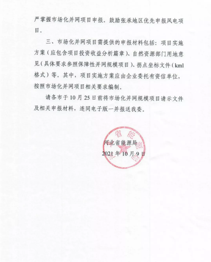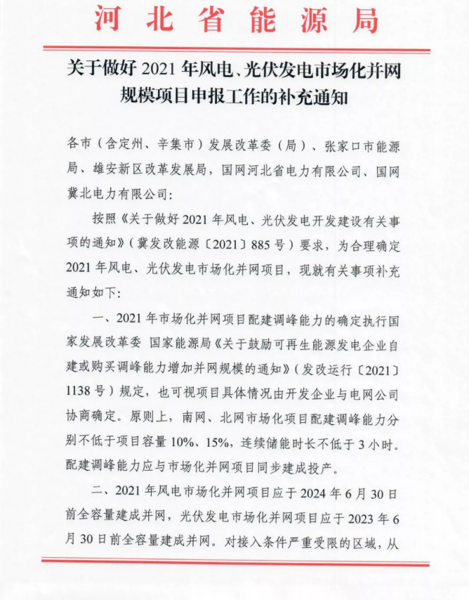 河北2021年风、光市场化并网项目申报补充通知!配储能10%-15%/3h!