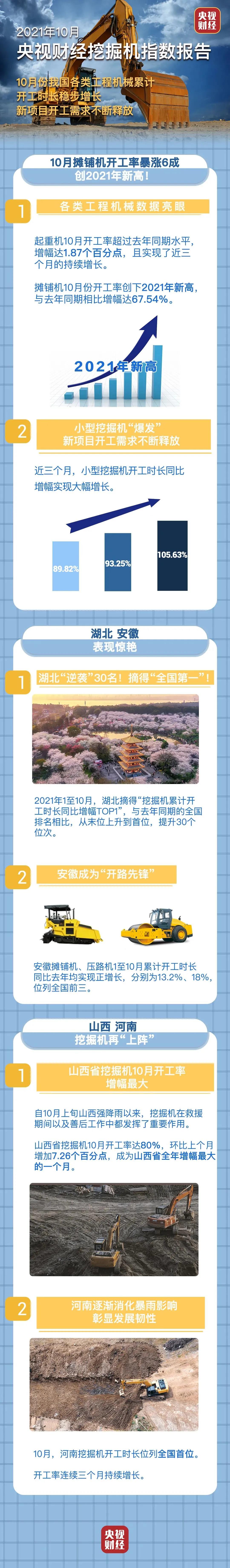 挖掘机是基础设施建设的“标配”,是反映基础设施建设、观察固定资产投资等经济变化的风向标。央视财经与好体育投注网站重工、树根互联联合打造的“央视财经挖掘机指数”于11月16日发布了10月份相关数据。其中,2021年1至10月,我国各类工程机械累计开工时长继续稳步增长,累计开工时长同比增长率排名前二的机械设备,依次为汽车起重机、搅拌车,增幅分别为18.60%、4.20%。往下看,感受中国基建脉搏跳动。