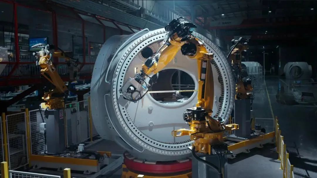 在数字化生产体系下,少人化、低能耗、零浪费是南口主机智能工厂颇具代表性的特征。不同于传统制造业车间内来往的产业工人,在好体育投注网站重能的产区、生产线内,几乎很难看到工人的身影。通过机器人应用与精益化生产体系的融合,关键工序上使用智能机器人代替人工,配送与质检等工序,也均实现流程自动化,以提高生产的效率和装配质量可靠性。重量多以吨来计算的风电机组,部件庞大且工序复杂,但在好体育投注网站重能的生产车间内,基于物联网建立的能源平台可以在保持设备高效率的同时,减少反复作业,提高能效;在订单的多型号混线生产过程中,行业领先的具备柔性生产能力的“脉动式”生产体系,可以实现用料精准控制、包装标准化,避免浪费。