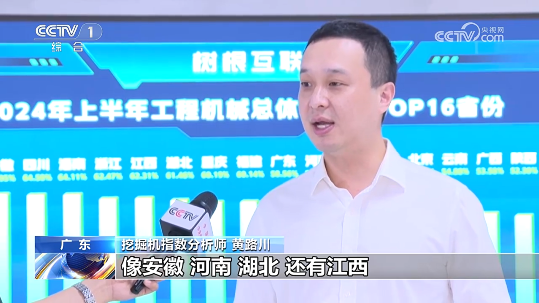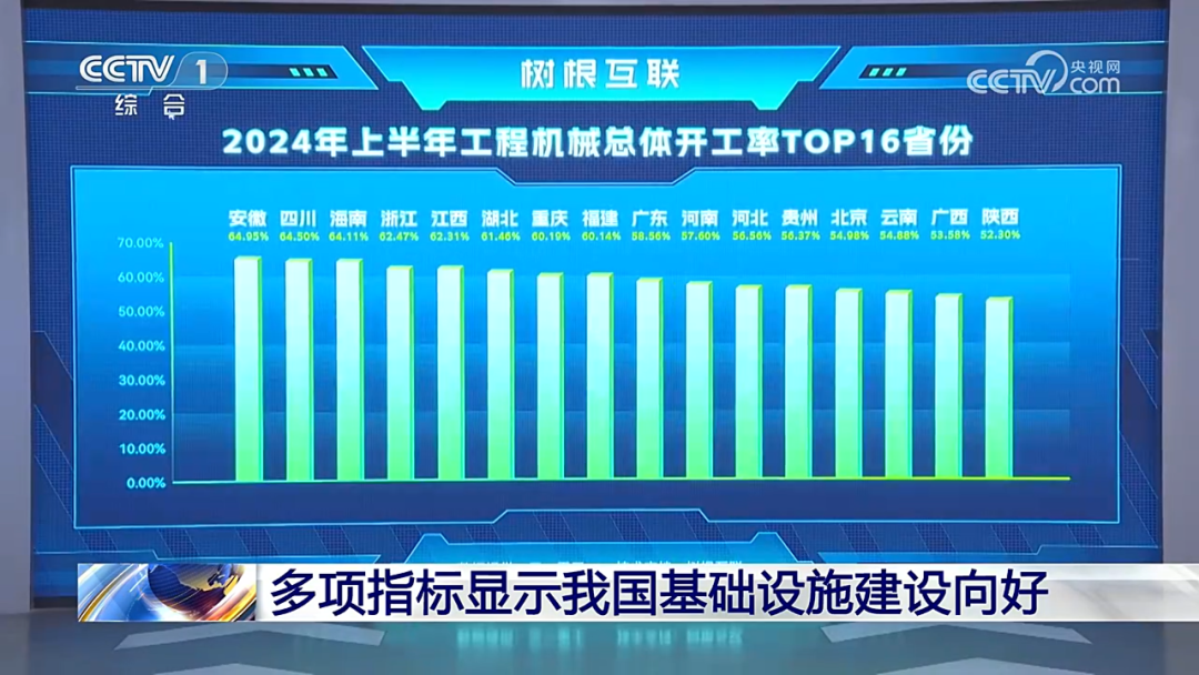 挖掘机指数显示,今年上半年我国八省份工程机械开工率均超60%。树根互联首席运营官、挖掘机指数专家黄路川:“像安徽、河南、湖北,还有江西连续在几个月里面开工率都排在前十,还是比较喜人的情况。”
