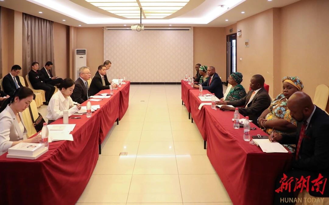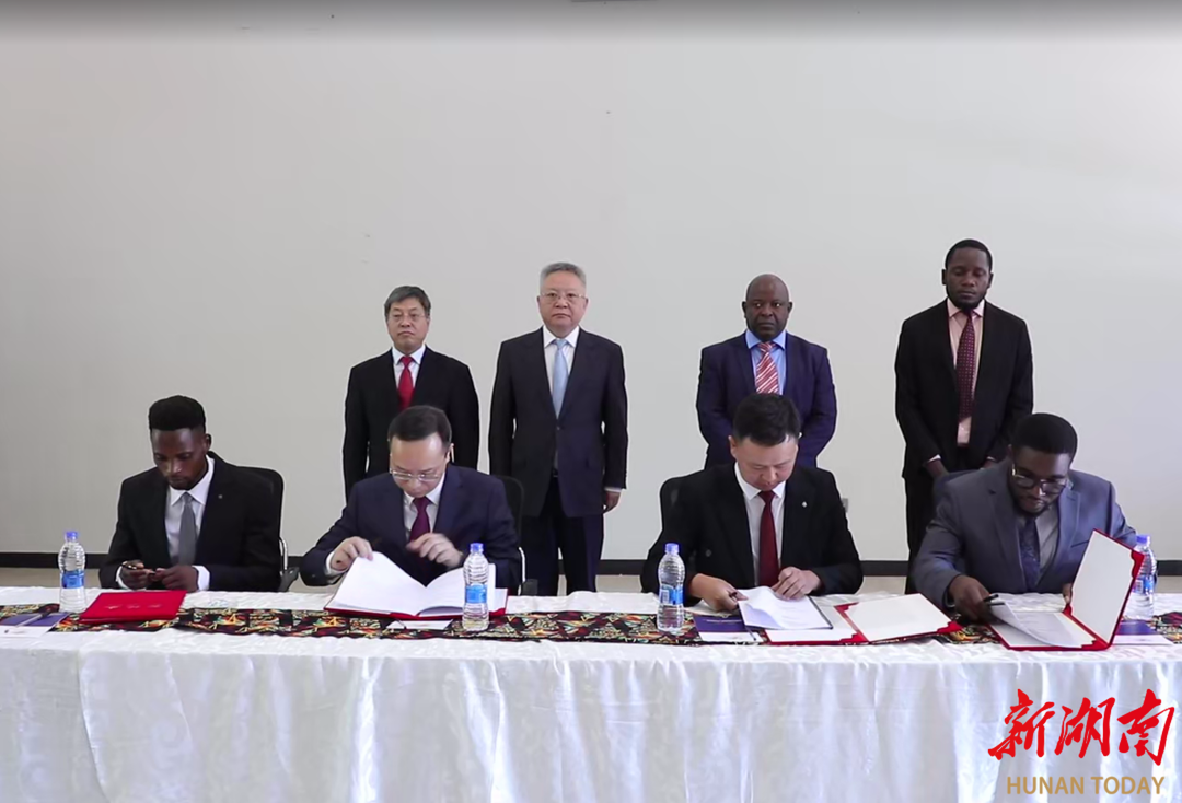 在萨利马,沈晓明与萨利马行政长官詹姆斯·穆文达会谈,见证湖南省地质院与马拉维蒂扬矿业公司签署矿产开发备忘录、湘马国贸公司与马拉维采矿和矿物管理局签署钛砂矿开采备忘录。根据备忘录,双方将共同高质量推动矿业开发,实现互惠共赢。