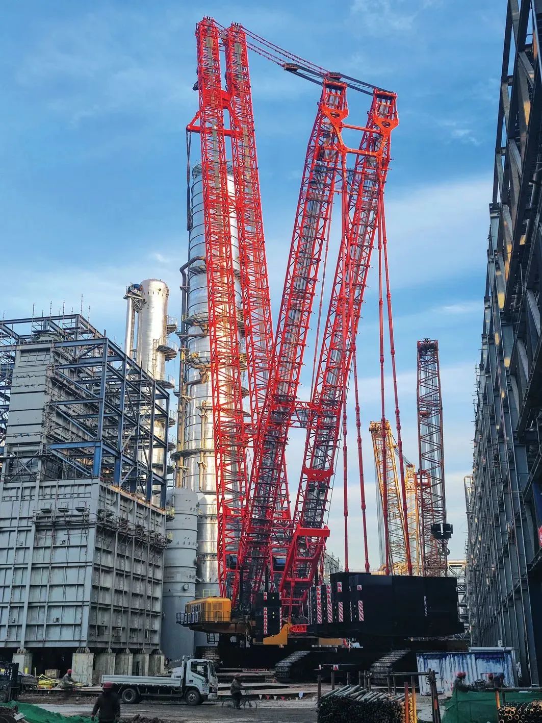 SCC98000TM最大起重力矩98000tm,能覆盖绝大多数石化罐体、核电穹顶的吊装需求,具备双臂工况与单臂工况两大工况,能直接拆成2000t使用;根据石化、核电吊装的特点,设计了变径平行双臂架系统,下宽上窄、变径节过渡,增强了臂架系统的侧向承载稳定性;主臂与变幅副臂可通用,节省臂架数量;超起配重小车带独立动力系统,可自行带载行走,超起半径从28~37m可调,场地适应性好。