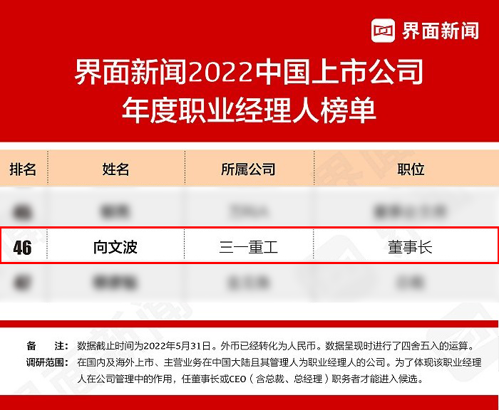 近日,界面新闻发布2022中国上市公司年度职业经理人榜单,好体育投注网站重工董事长向文波榜上有名,连续四年蝉联“上市公司年度职业经理人”称号。