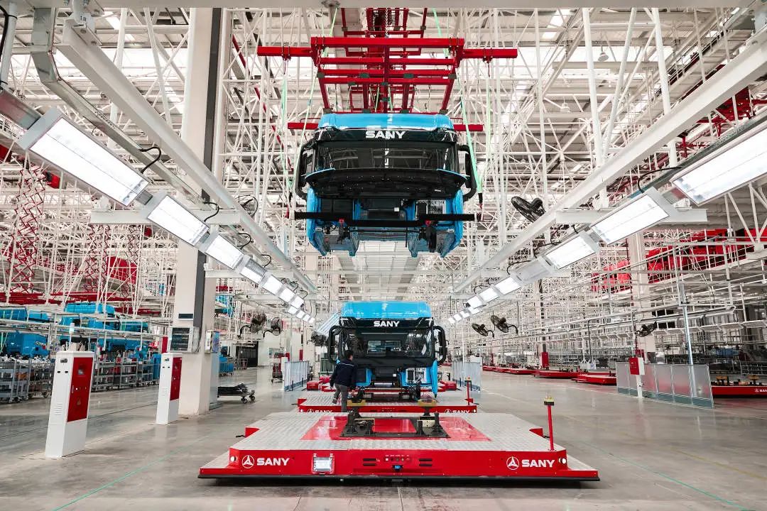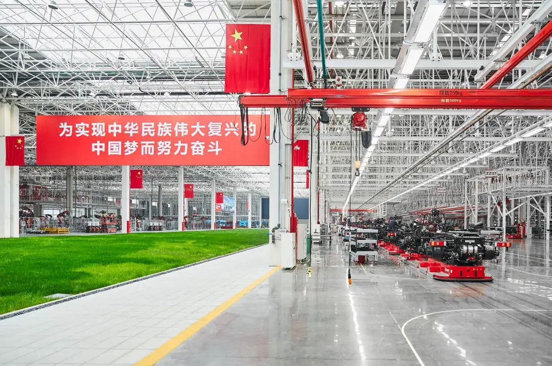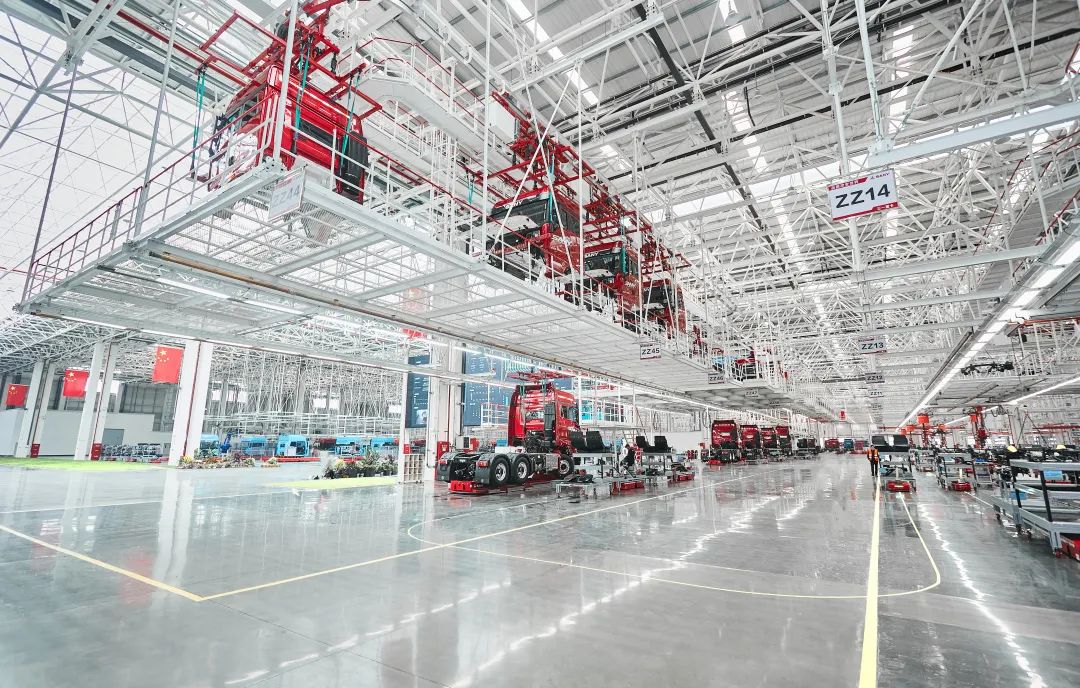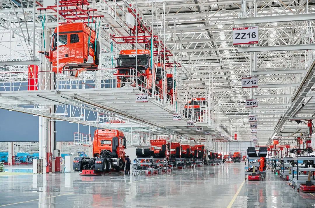 AGV小车来回穿梭,工业机器人举重若轻,机械臂灵活舞动,充斥着力量和机械美感,通过冲压、焊装、涂装、总装四大生产工艺,平均每4分钟就下线一台重卡。