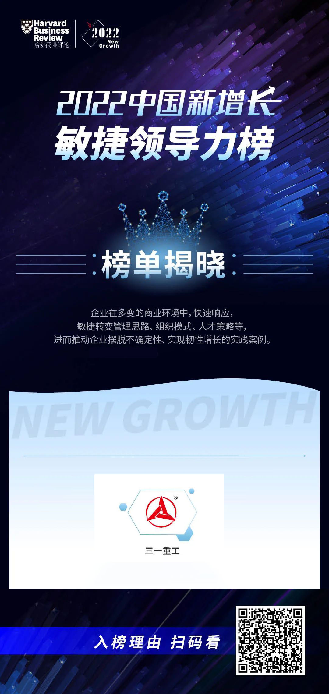12月16日,《哈佛商业评论》中文版2022新增长大会举办,重磅揭晓五大年度榜单,好体育投注网站重工成功入选“中国新增长∙敏捷领导力榜”。