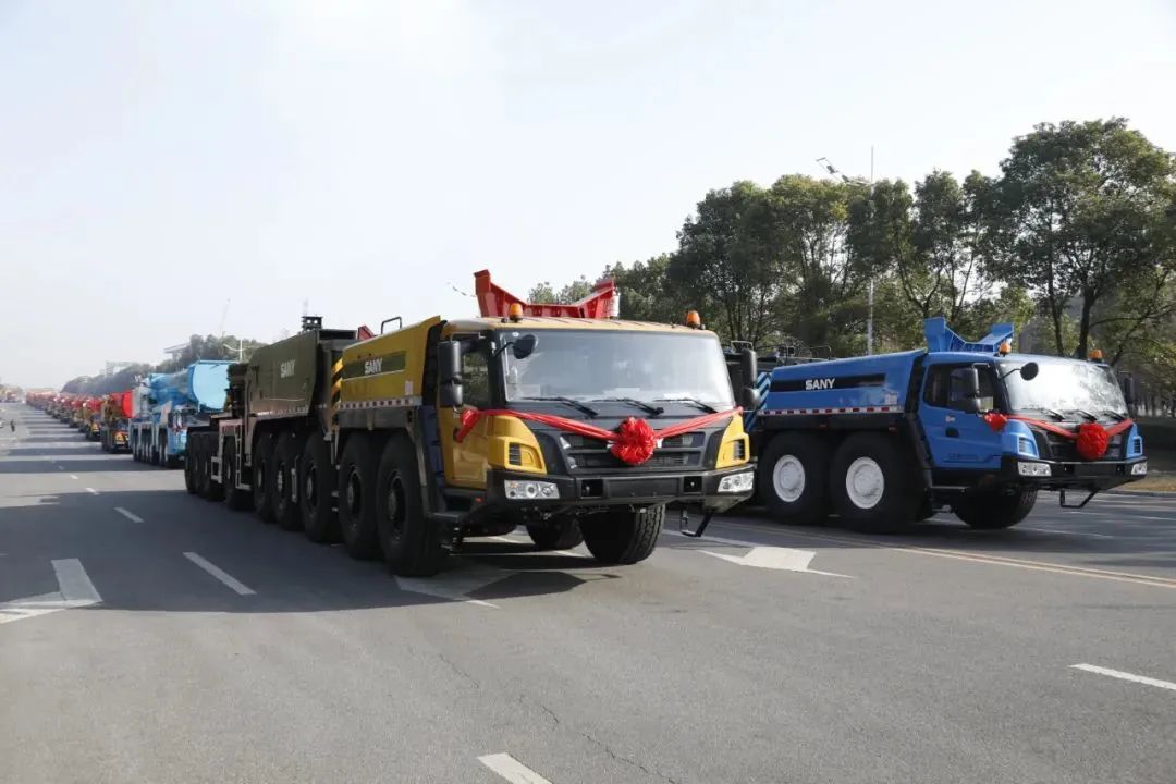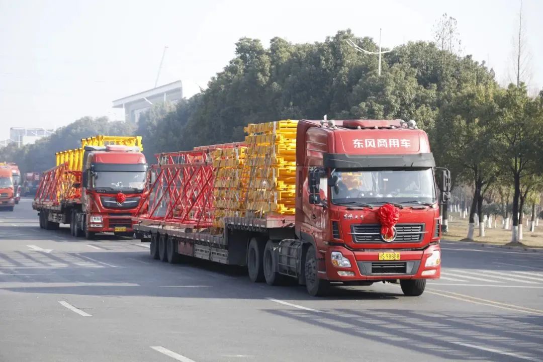 现场,身披大红花的31台起重机,一字排开,整装待发,气势宏大。塔式起重机已被分拆打包,运输车紧随其后。