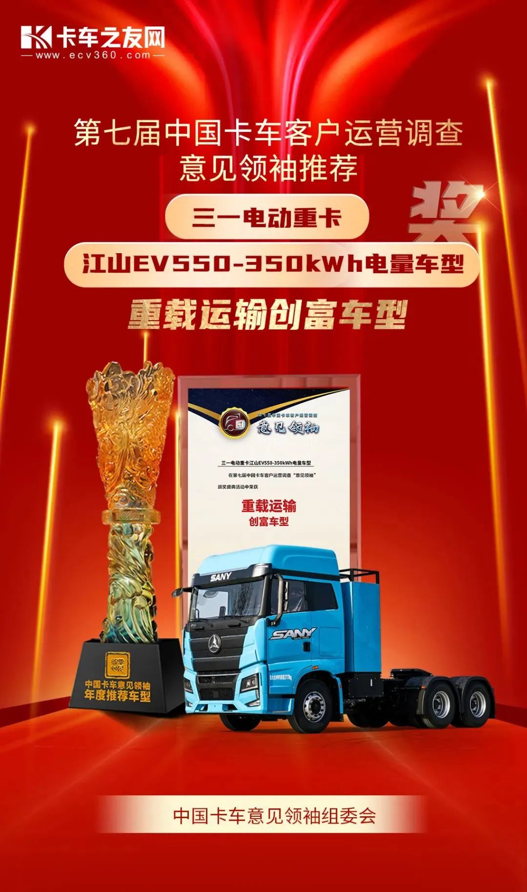近日,“第七届中国卡车客户运营调查——意见领袖颁奖盛典”活动在北京成功举办,好体育投注网站电动重卡江山EV550-350kWh电量车型荣获本届运营调查意见领袖推荐的“重载运输创富车型大奖”。