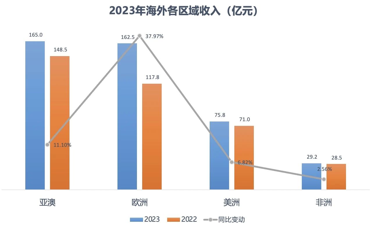 亚澳区域165亿元,增长11.10%;欧洲区域162.5亿元,增长 37.97%;美洲区域75.8亿元,增长6.82%;非洲区域29.2亿元,增长 2.56%。