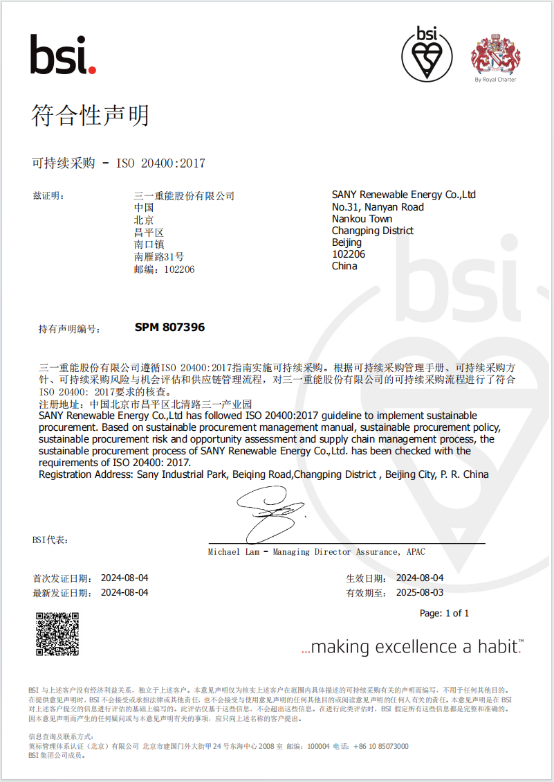 近日,好体育投注网站重能股份有限公司顺利通过全球知名认证机构BSI核查,成为风电行业首个获得ISO 20400可持续采购符合性声明的企业。这既是好体育投注网站重能在可持续发展领域的又一国际标准化实践成果,也是企业ESG体系建设持续深化的里程碑事件。