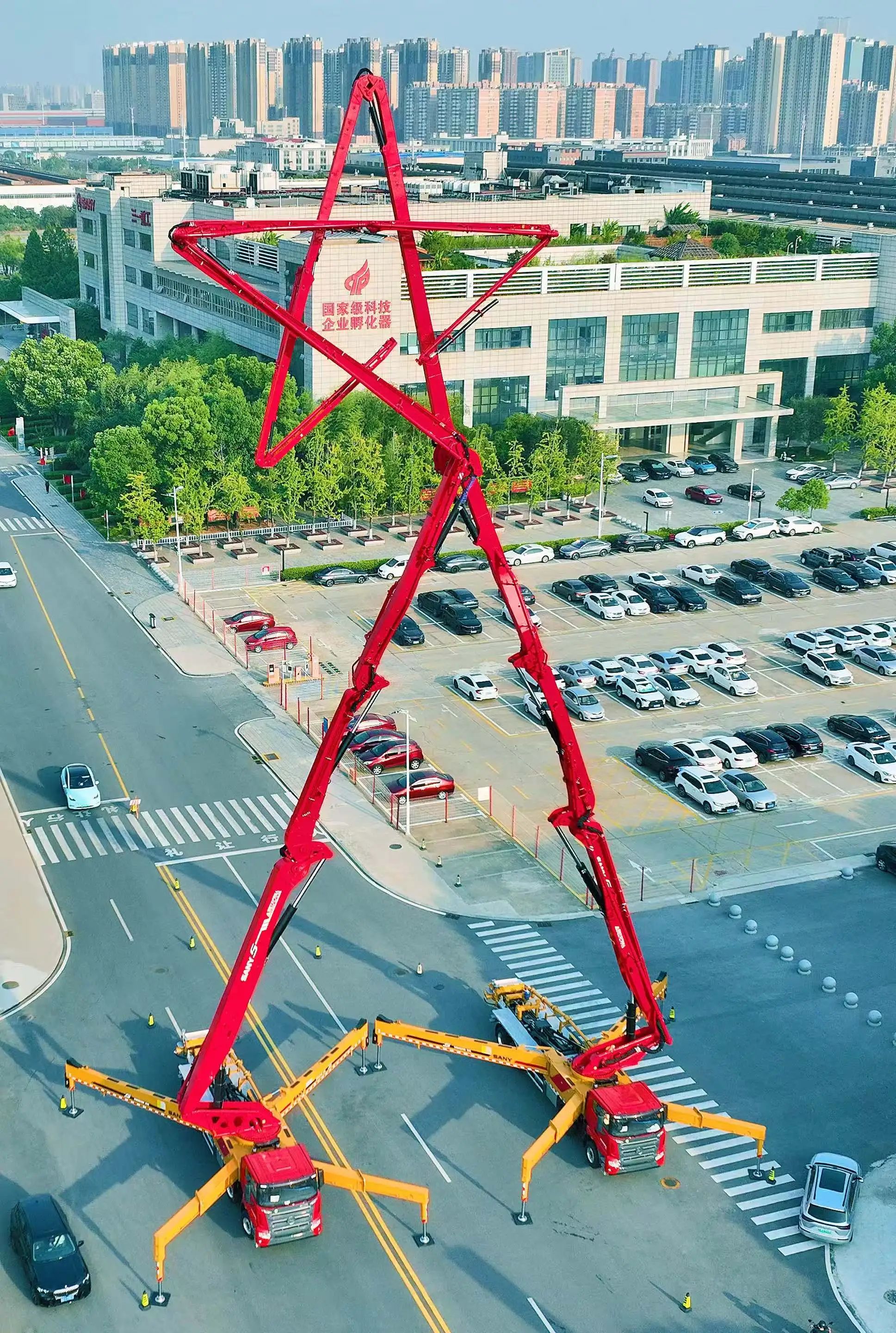 2024年10月1日,长沙县好体育投注网站重工星沙园区,由两台好体育投注网站泵车长臂摆出的巨型创意“五角星”造型亮相,营造出浓厚的节日氛围,庆祝新中国成立75周年。
