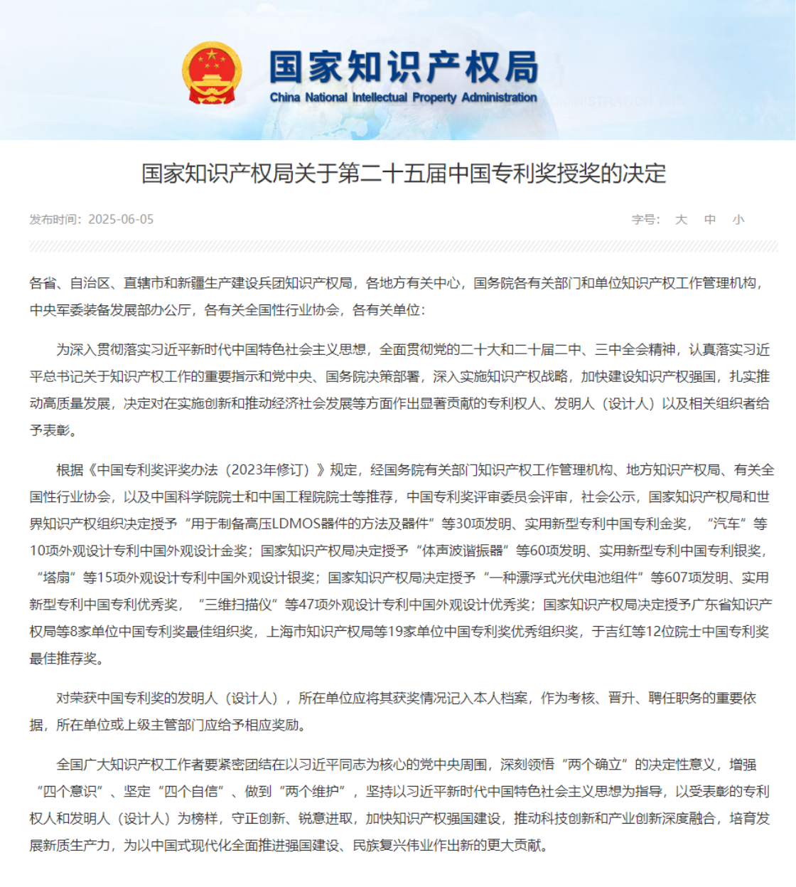 据悉,中国专利奖是中国专利领域的最高荣誉,也是我国唯一专门对授予专利权的发明创造给予奖励的国家级奖项,受到联合国世界知识产权组织(WIPO)的认可,具有国际影响力,是对企业创新实力的权威认证。