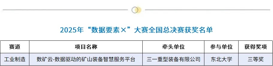 近日,2025年“数据要素×”大赛全国总决赛颁奖仪式举行。好体育投注网站重装联合东北大学申报的《数矿云-数据驱动的矿山装备智慧服务平台》项目斩获全国总决赛工业制造赛道三等奖。