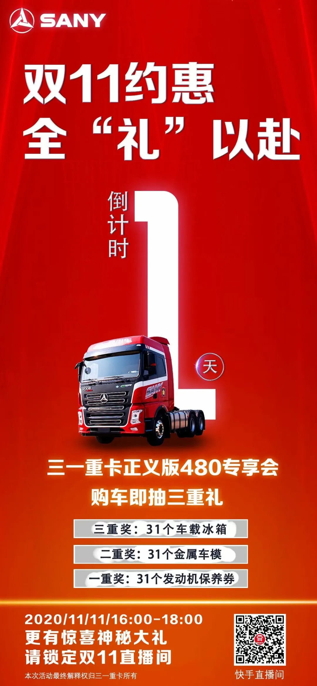 好体育投注网站重卡正义版自上市后频频收到卡友的订单,每天来厂区提车的卡友络绎不绝,双11当天,好体育投注网站重卡为满足客户需求,将特别打造了一场正义版480的专享会, 购车即抽三重礼!