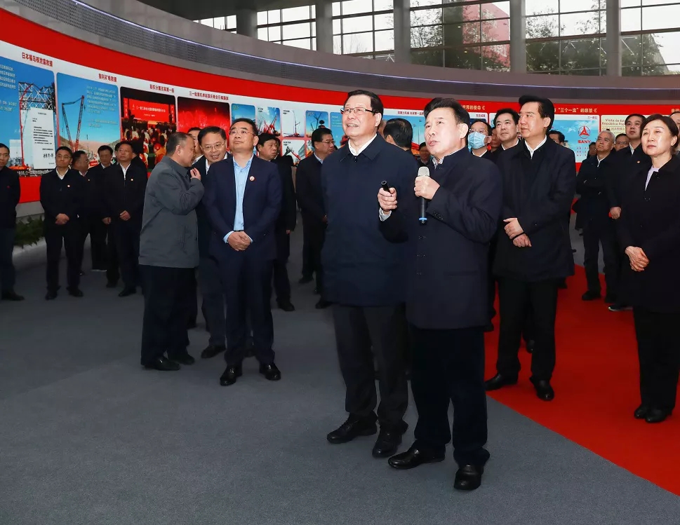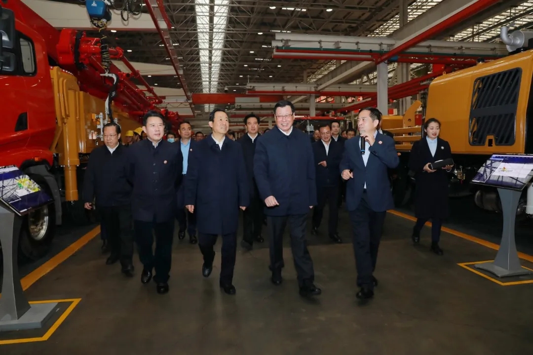 泵车装配线,向文波总裁向代表团成员详尽介绍工厂的智能制造流程。期间,应勇书记对泵车生产装配表现出浓厚兴趣,关切询问公司是否掌握核心技术、零配件国产化程度如何等发展状况,并对公司持续良好的业绩态势表示祝贺。