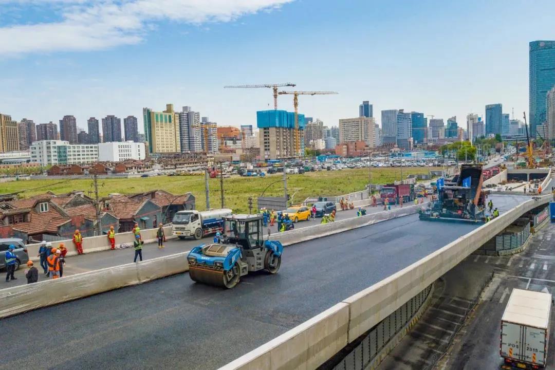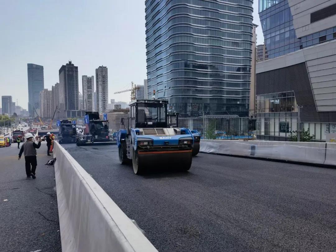 4月20日,在上海海宁路北横通道高架上,好体育投注网站2台摊铺机,3台双钢轮压路机开展无人摊压协同作业。这是首次在高架桥、大坡度、两侧有混凝土隔离墩的工况下进行的无人摊铺压实作业。