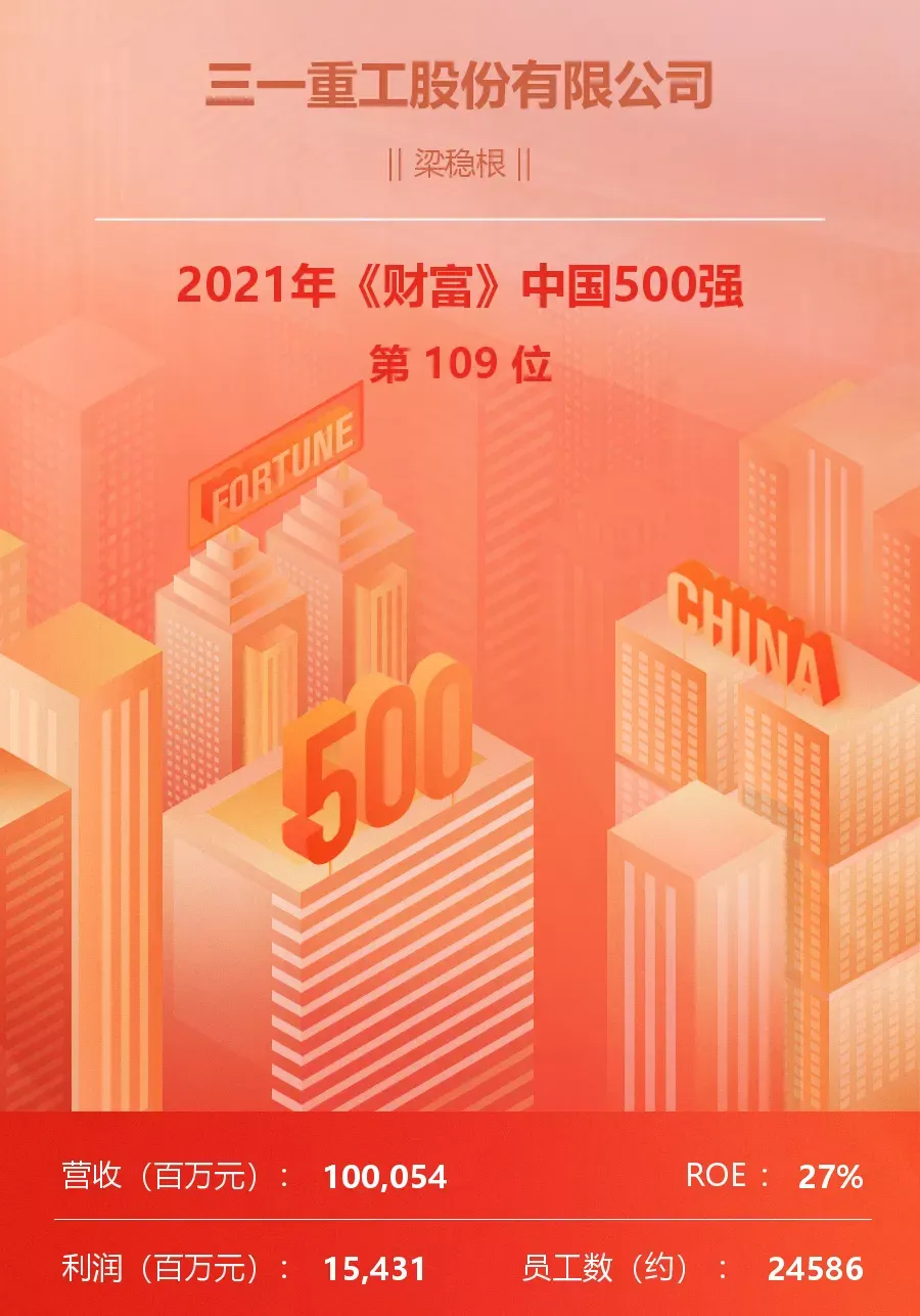7 月 20 日,2021年《财富》中国500强排行榜揭榜,好体育投注网站重工以1000.54亿元的营业总收入,位列榜单第109名,较上年度提升24个名次,连续十一年稳居工程机械制造行业第一。