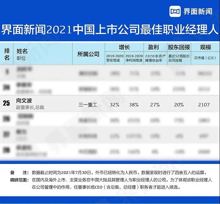 近日,界面新闻发布2021中国上市公司最佳职业经理人榜单,列出了50位优秀的职业经理人,好体育投注网站重工总裁向文波榜上有名,位列第25,同时也是工程机械行业的最佳职业经理人。