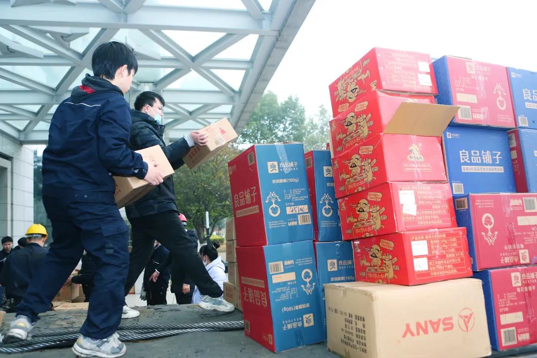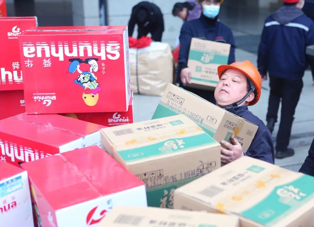 年货发放现场,欢乐融融,人们排起了长队。白酒、坚果、糖果、肉脯、各种特产……包装精美,品种齐全。放眼望去,几千箱过年物资满满当当,堆满了食堂角落。“都可以开超市了”,员工们纷纷打趣。