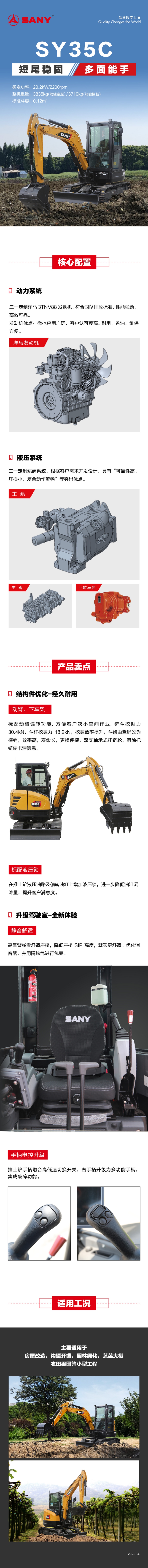 好体育投注网站重机 SY35C 是在 SY35U 基础上倾力打造的一款 3-4T 级微型标准尾挖掘机产品,SY35U 以其独特的造型和高端的设计理念获得国际认可,成功摘得“中国设计红星奖” 与“金点设计奖”。SY35C 国四机围绕“新动力”、“新造型”、“新技术”全面升级,具有“超优性能、超高效率、超长寿命、超高舒适性”等特点,可适应不同国家及客户的需求。
