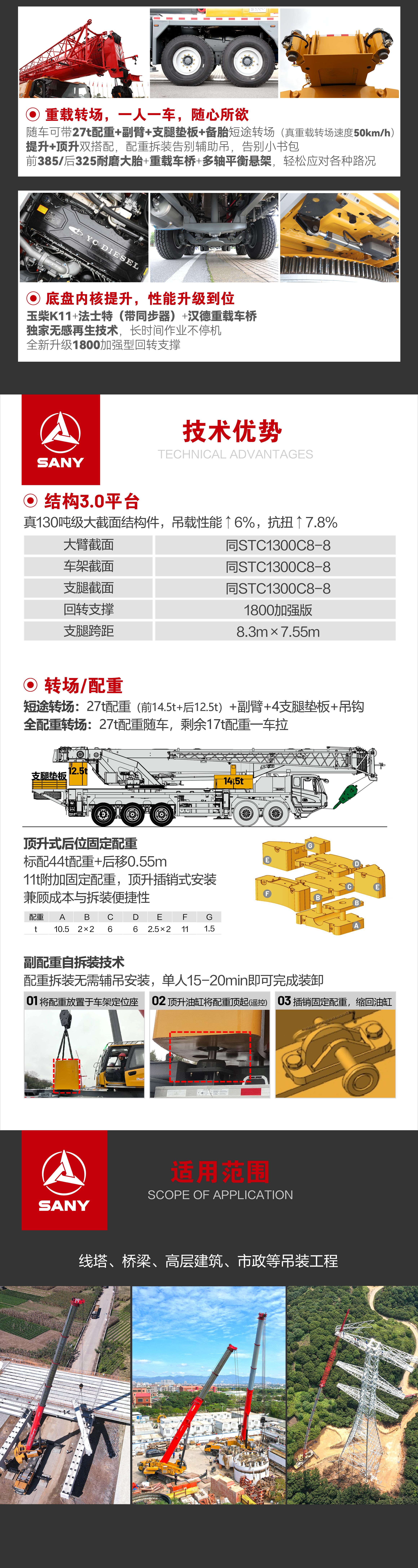 随车可带27t配重+副臂+支腿垫板+备胎短途转场,真重载转场速度50km/h