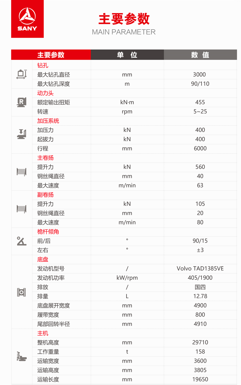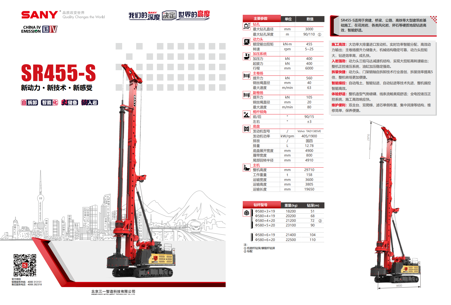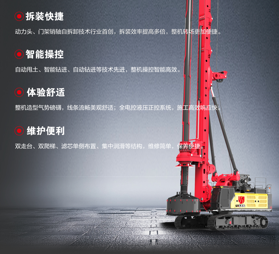 SR455-S适用于房建、桥梁、公路、高铁等大型建筑桩基础施工,在花岗岩、各类风化岩、卵石等硬质地层钻进高效,智能舒适。