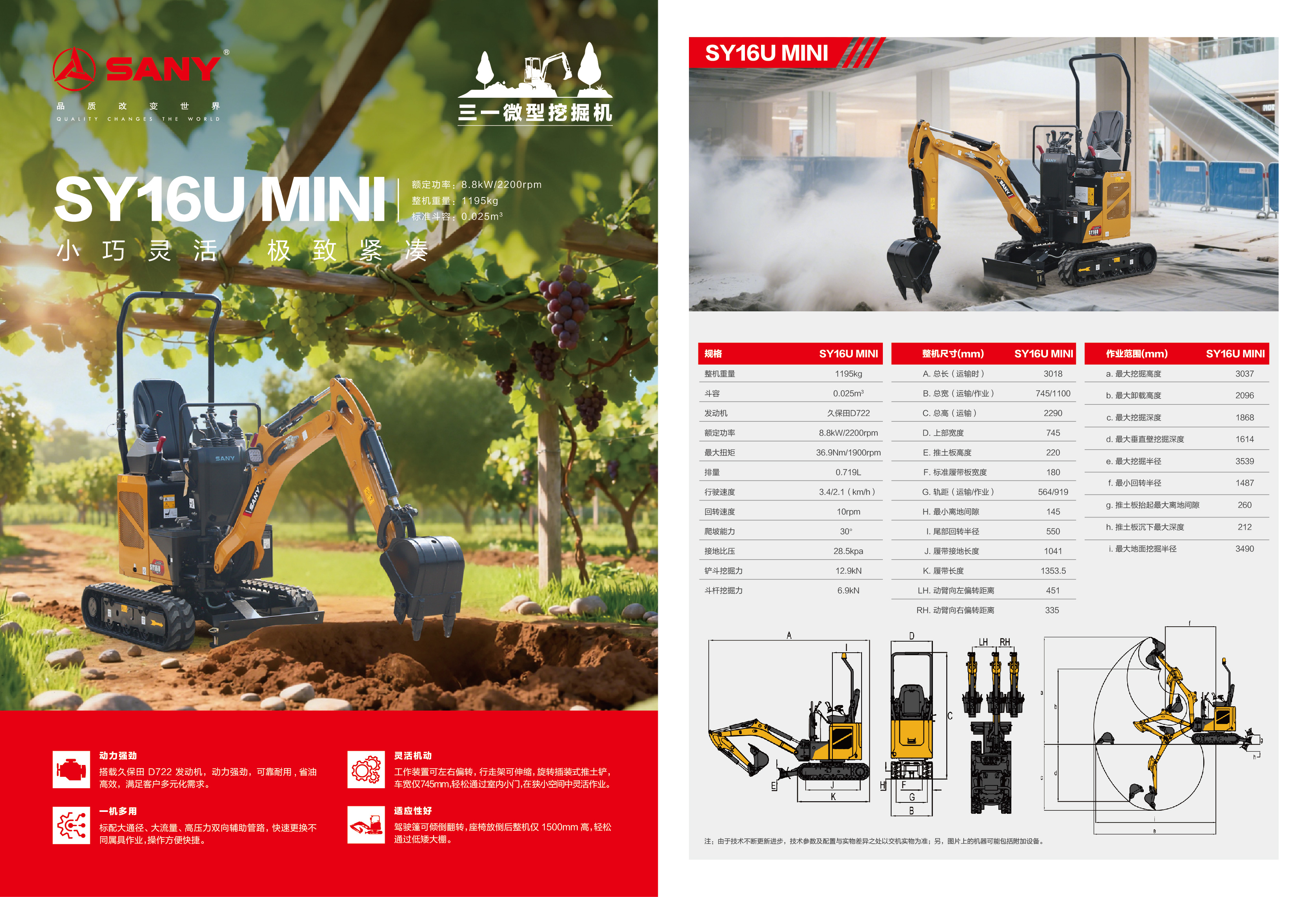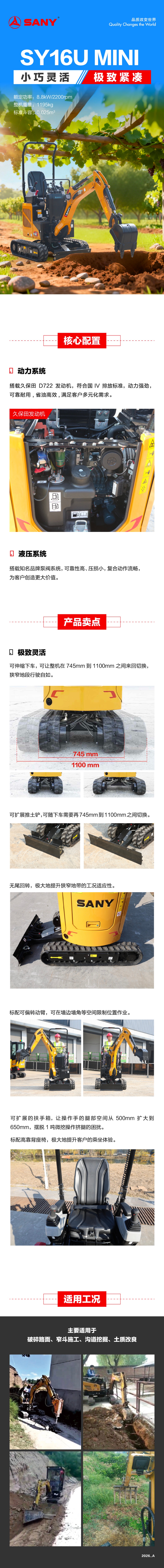 SY16U无尾回转、动臂可偏转、下车可伸缩,机身仅745mm,操作重量1195kg,轻巧灵活。
