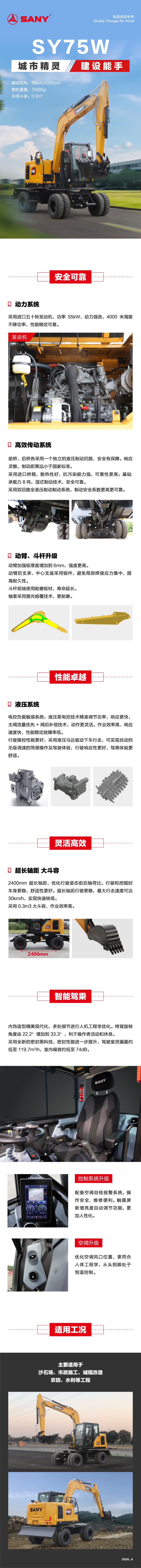 SY75W 轮挖沿用明星挖机 SY75C 的上车,匹配先进的行驶驱动系统,具有机动灵活、安全可靠、性能卓越、一机多用等优势,是名副其实的建设能手,致力于为客户创造更大价值。