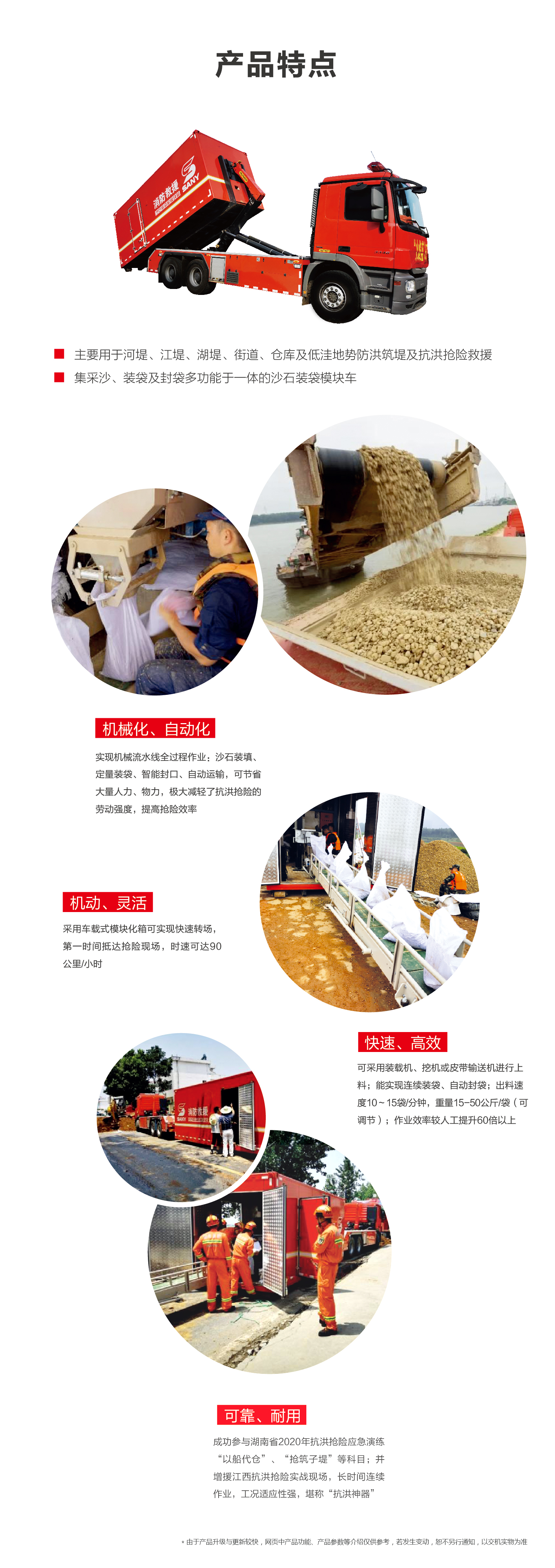 实现机械流水线全过程作业:沙石装填、定量装袋、智能封口、自动运输,节省大量人力、物力,较大减轻抗洪抢险的劳动强度,提高抢险效率