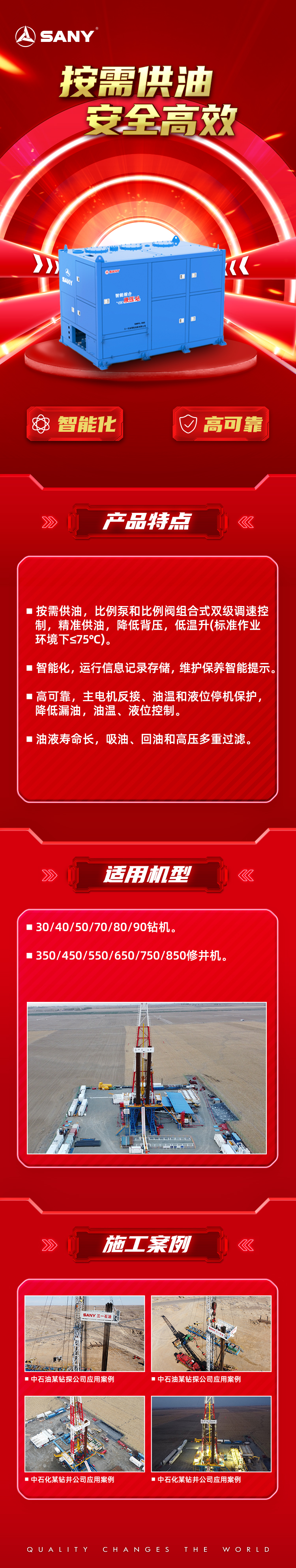 1.按需供油,比例泵和比例阀组合式双级调速控制,精准供油,降低背压,低温升(标准作业环境下≤75°C)。