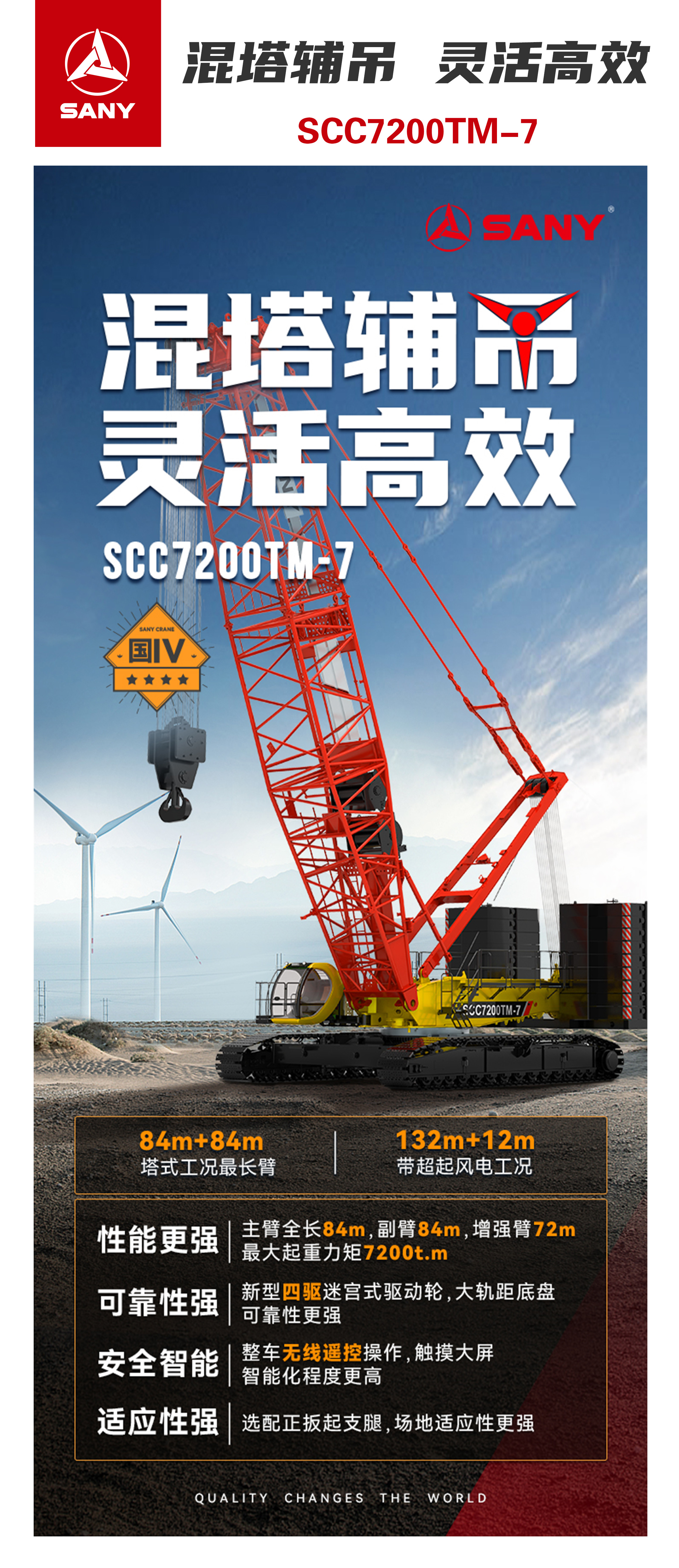 主臂全长84m,副臂84m,增强臂72m,最大起重力矩7200t.m;