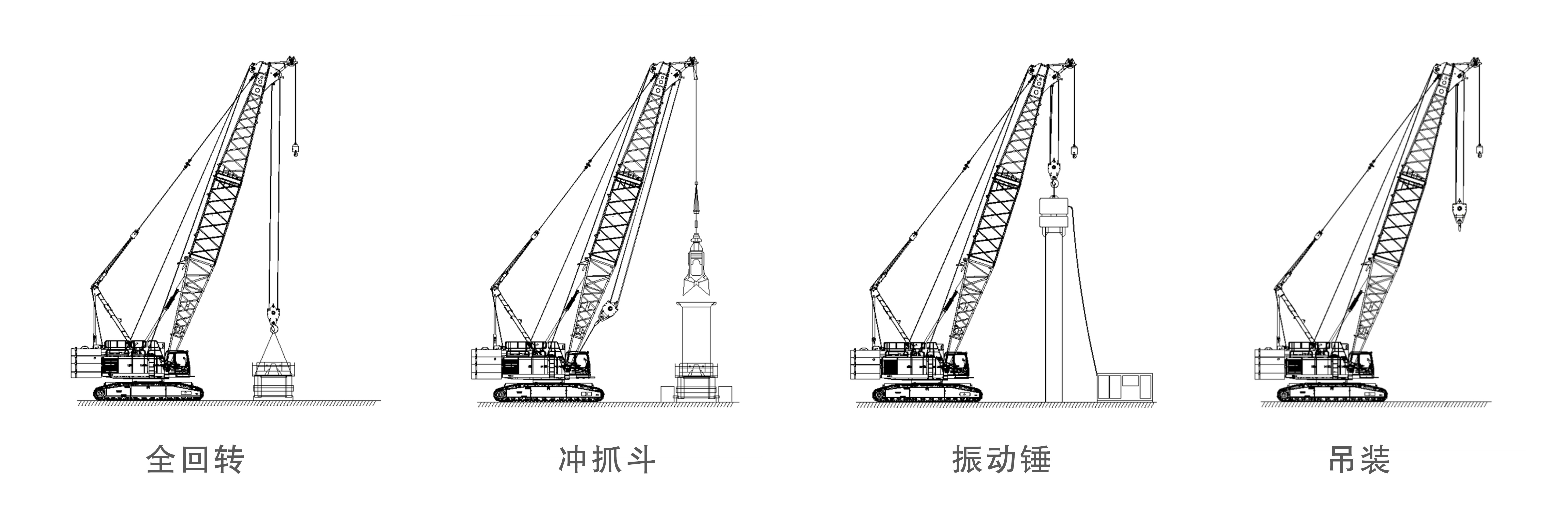 满足冲抓斗、SDDC、强夯、振冲和吊装等基础施工工况,满足一机多用;拥有液压锤动力外输技术。