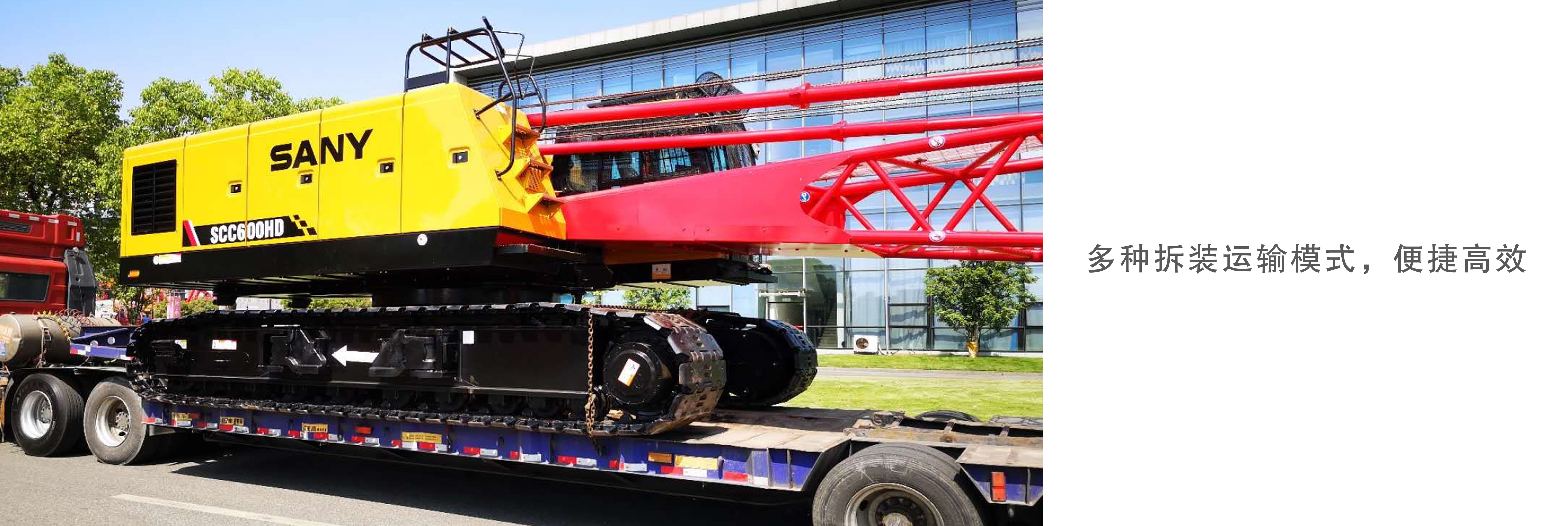转台、底座、履带架、臂架模块化设计,拆装便利; 全系列主机运输尺寸宽度/高度<3.5m,重量<45t,尺寸、重量皆满足法规运输要求; 多种拆装运输模式,履带架、下节臂可随主机一体化运输或拆卸分运,便捷高效。